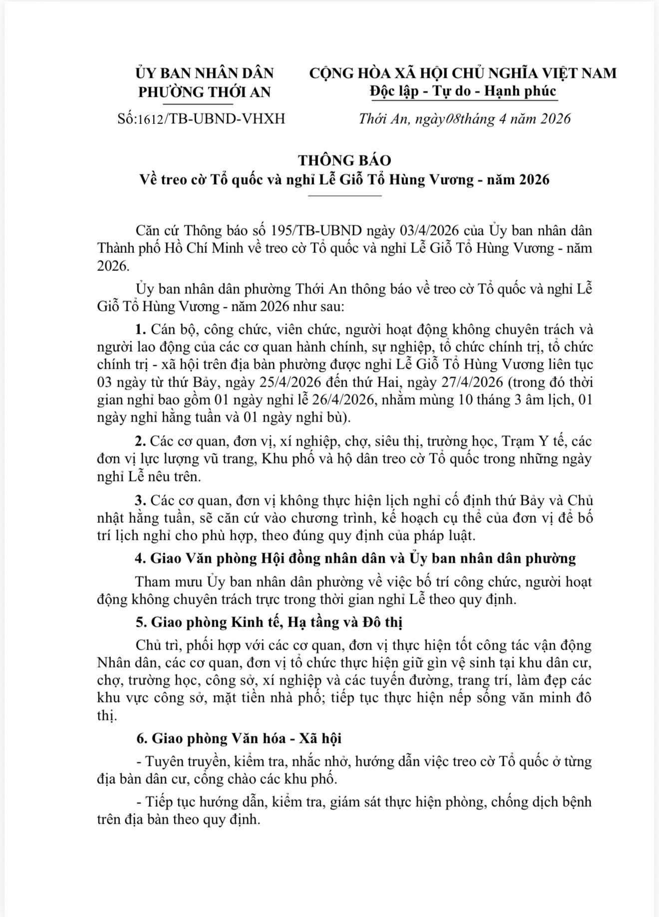 PHƯỜNG THỚI AN: 📣 THÔNG BÁO VỀ TREO CỜ TỔ QUỐC VÀ NGHỈ LỄ GIỖ TỔ HÙNG VƯƠNG - NĂM 2026