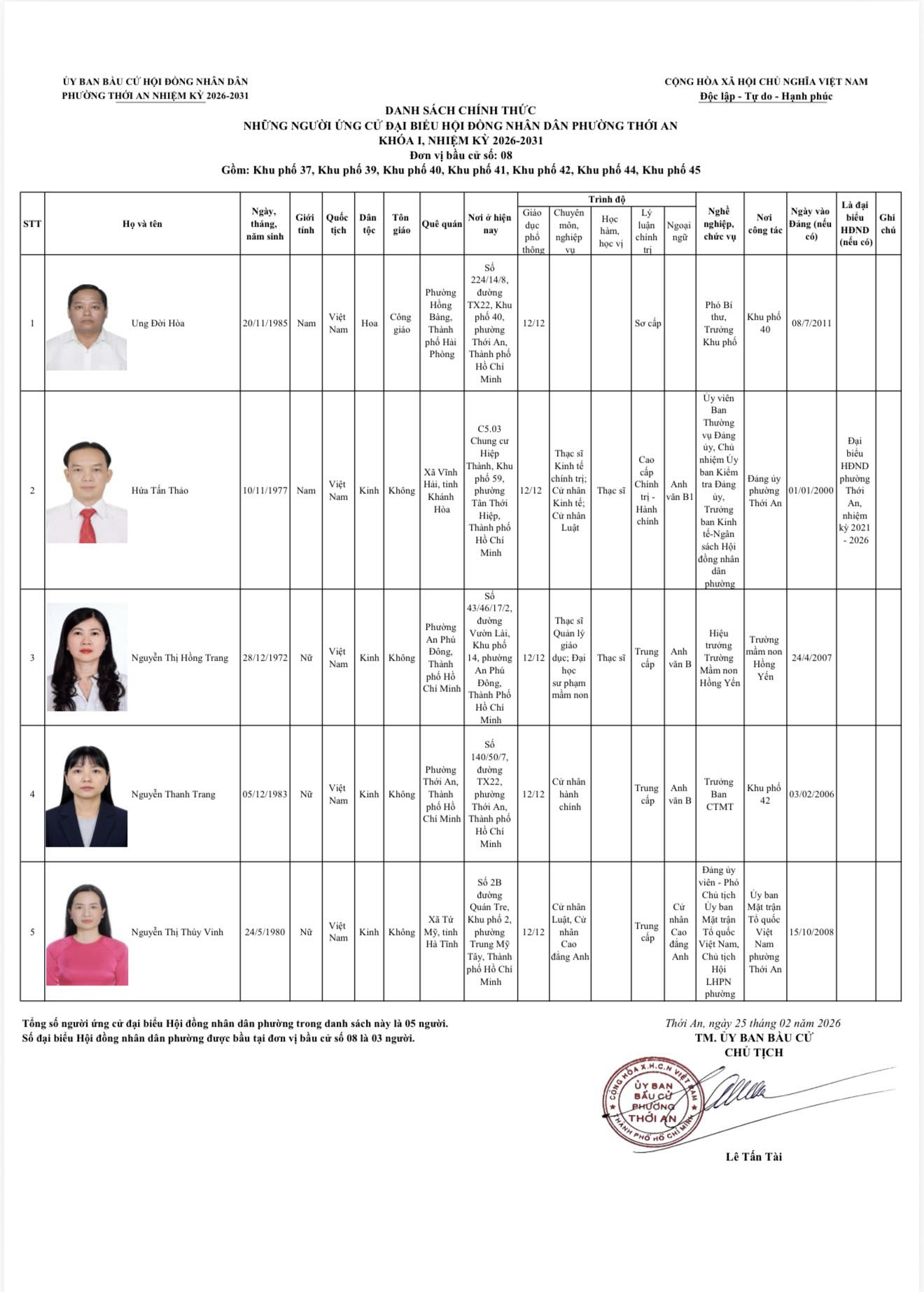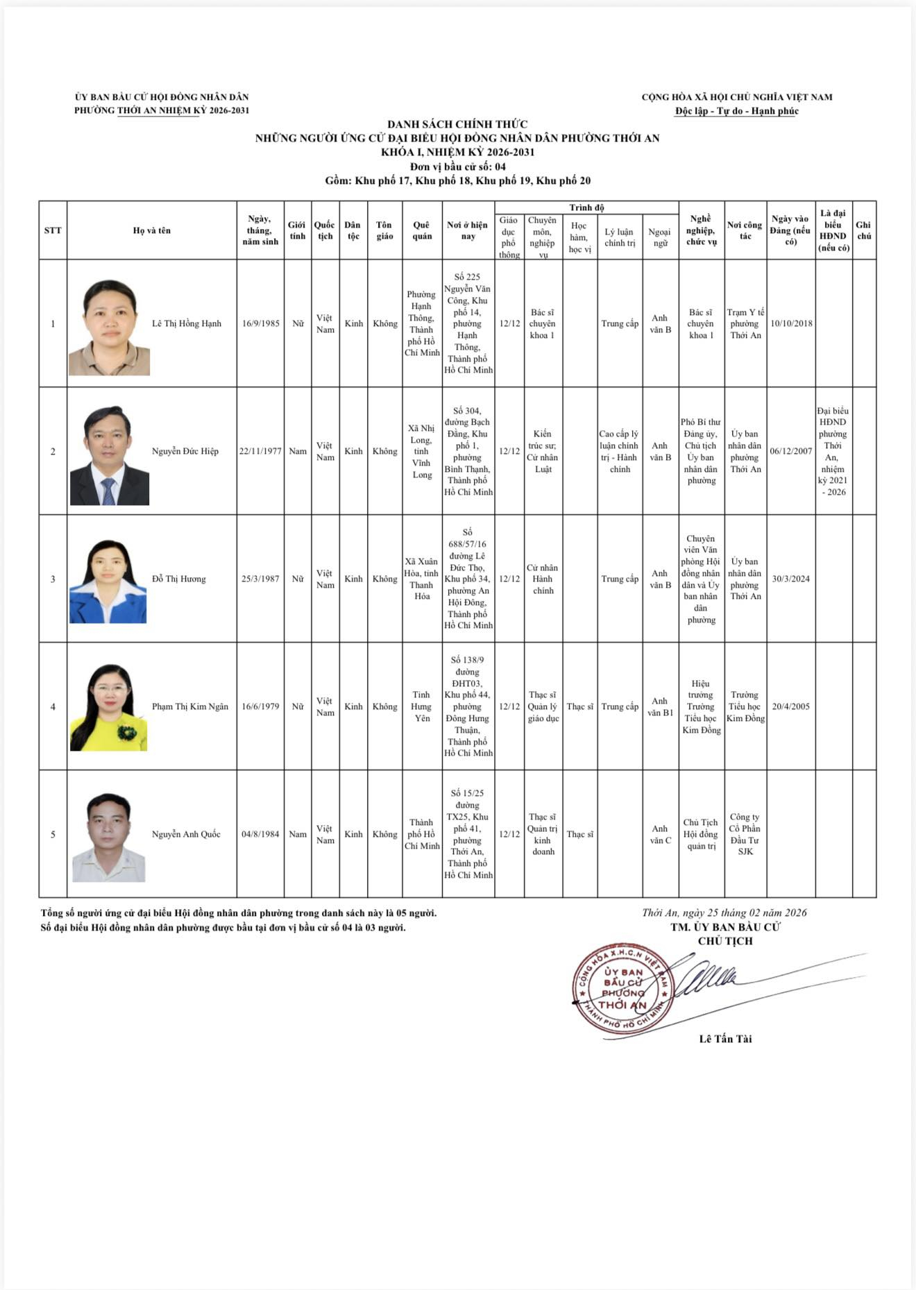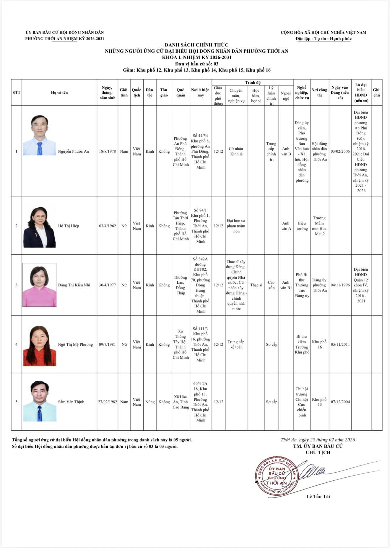 THÔNG BÁO DANH SÁCH CHÍNH THỨC NHỮNG NGƯỜI ỨNG CỨ ĐẠI BIỂU HỘI ĐỒNG NHÂN DÂN PHƯỜNG THỚI AN KHÓA I, NHIỆM KỲ 2026-2031