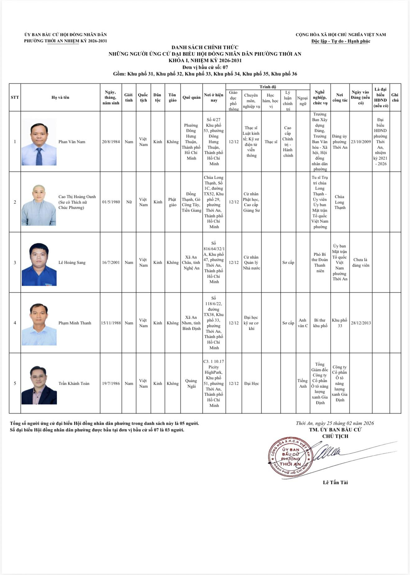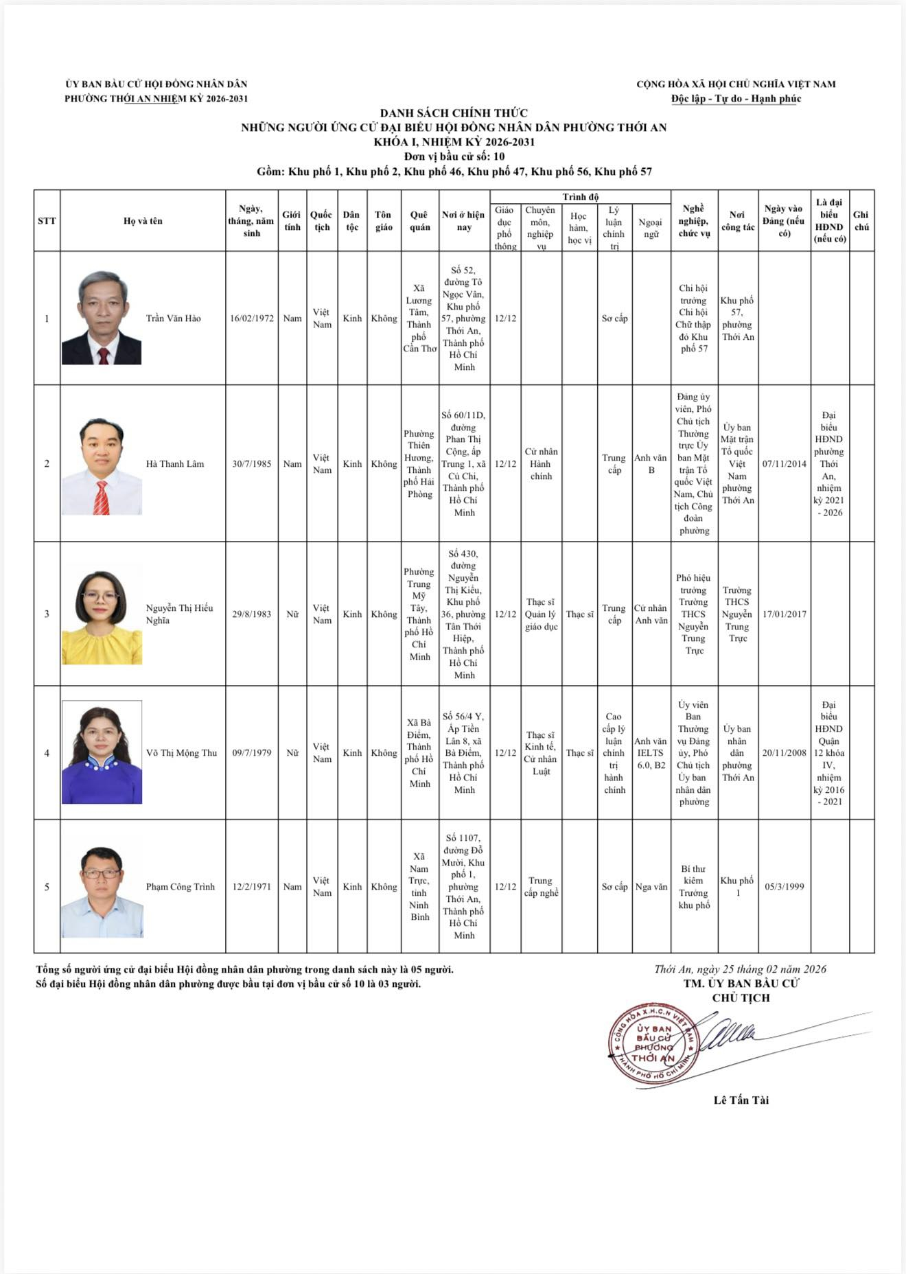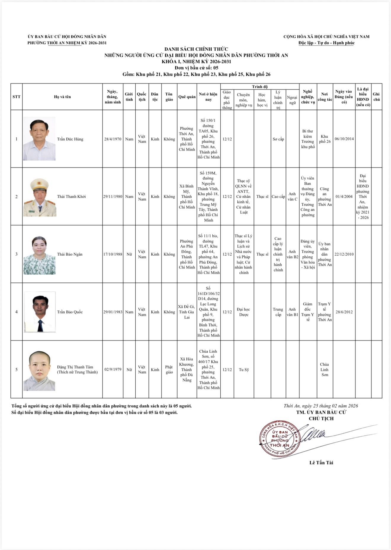 THÔNG BÁO DANH SÁCH CHÍNH THỨC NHỮNG NGƯỜI ỨNG CỨ ĐẠI BIỂU HỘI ĐỒNG NHÂN DÂN PHƯỜNG THỚI AN KHÓA I, NHIỆM KỲ 2026-2031